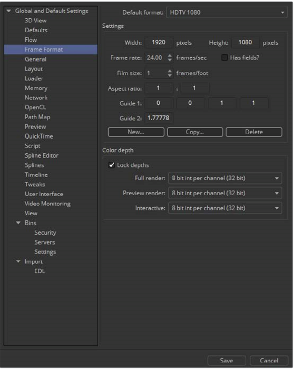 たとえば、ソースコンテンツの大部分が1080pの高精細度になるプロジェクトでは、一般的に使用するHDソースコンテンツのフレームフォーマットと一致するようにグローバルプリファレンスを設定することが理にかなっています。
