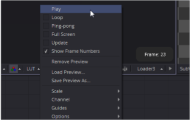 フリップブックのプレビューをビューアに読み込んだままにすると、ビューアのコンテキストメニューにループまたはピンポンの再生を有効にするオプションがあります.Fusionのインターフェイスの残りの部分を使わずにクリップにフォーカスするフルスクリーンモードに入ることもできます。