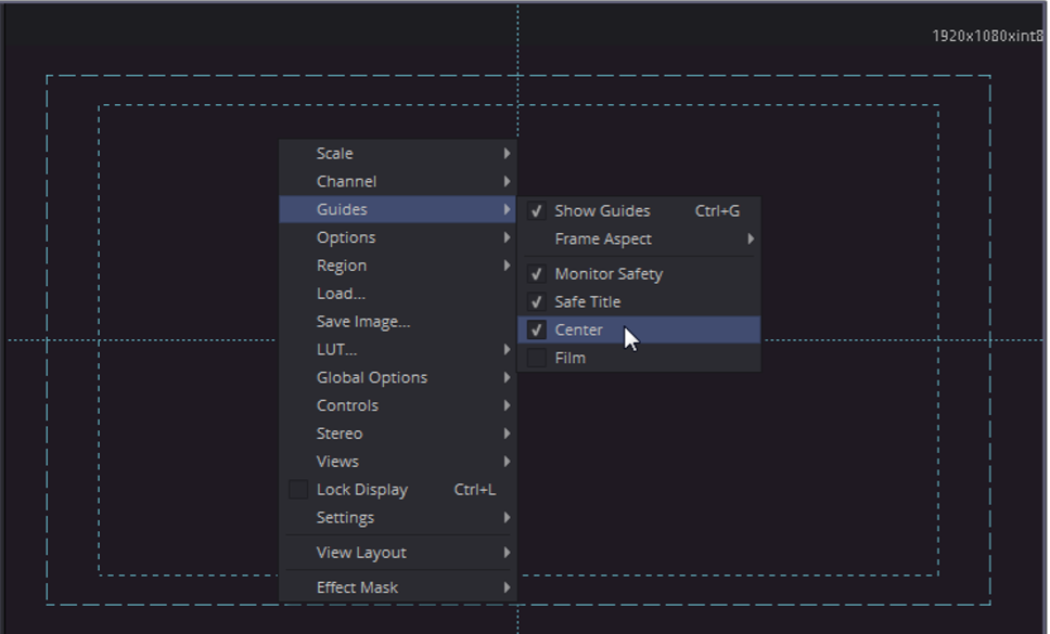 [ガイド]サブメニューを使用すると、4つのガイドのいずれかをビューアに表示するか非表示にするかを選択できます。