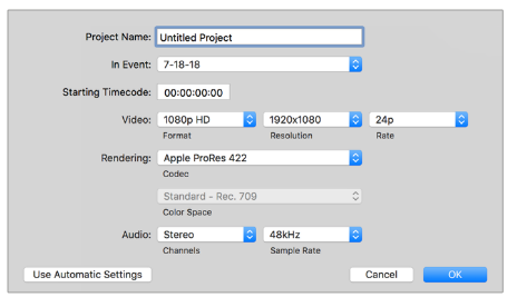 Final Cut Pro Xを使用してクリップを編集するには、新しいプロジェクトを作成し、適切なビデオフォーマットとフレームレートを設定する必要があります。この例では、ProRes 422 HQ 1080p24を使用しています。