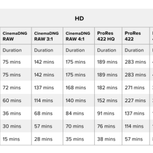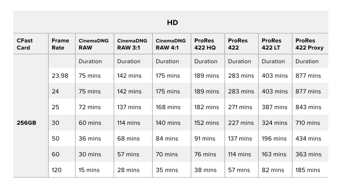 たとえば、3840 x 2160のApple ProRes 422 HQのストレージ速度は約880 Mbpsです。毎秒24フレームで、256GB CFast 2.0カードに約47分のビデオを録画できます。