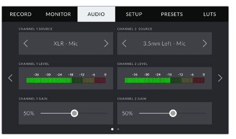 Blackmagic Pocket Cinema Camera 4Kのオーディオ設定は2ページにまたがっており、チャンネル1と2の間で分割されています。