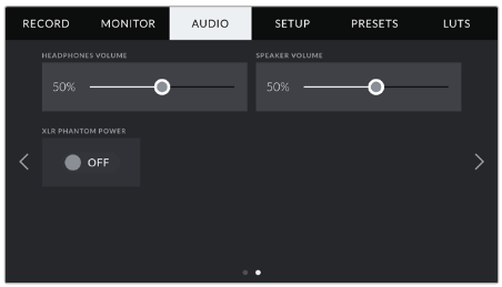 このスライダは、Blackmagic Pocket Cinema Camera 4Kの内蔵スピーカーの出力レベルを調整します。オーディオスライダを左右に動かしてレベルを調整します。