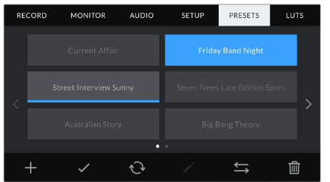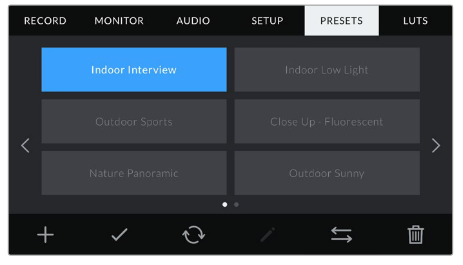 Blackmagic Pocket Cinema Camera 4Kの「プリセット」メニューの下部にあるボタンアイコンは、以下の機能に対応しています。