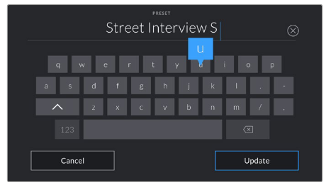 Blackmagic Pocket Cinema Camera 4Kの現在の設定をそのプリセットに保存するには、名前を入力して「更新」をタップします。