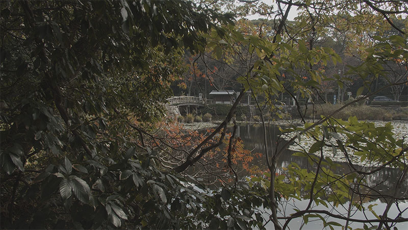 最初にカメラ調整するために人がいないところへ行って、カワセミでもいないかと探したのですが見ているとこには出てきてくれないもので、城に渡る橋とちょっとだけ紅葉した葉を入れて撮影しました。
