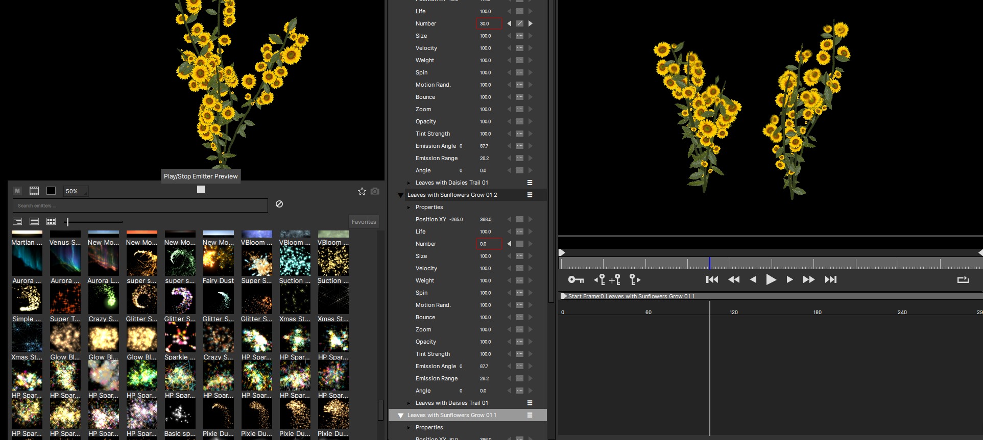 再生/停止ボタン:このコントロールはツールバーの中央にあり、プレビューを停止(一時停止)できます。通常はこれを行いたくないでしょうが、エフェクトを調べたり、エミッタのサムネイル画像を設定したりするときに便利です。