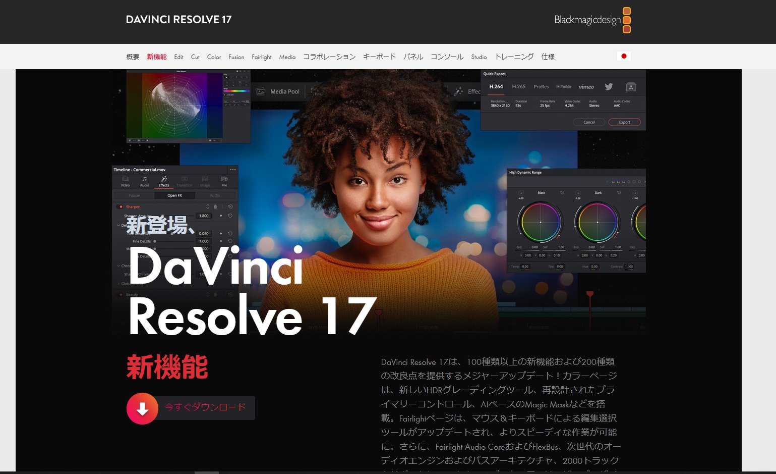 詳細をクリックすると、上記のサイトへ移動しDaVinci Resolve 17の魅力を寸分無く説明してくれます。