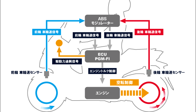 ABSが、停まる時に必要な安全機構でスリップしないようにブレーキングするのに対してHSTCは、走り出しなど後輪にトラクションがかかりすぎた時(前輪の動きに対して動きすぎる時)にアクセルを制御してスリップさせないように走る機能なので、目的は違っていても、動き的には似ているのかもしれないですね。