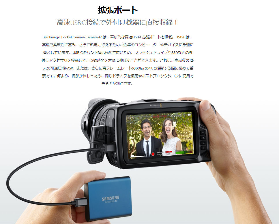 Blackmagic Pocket Cinema Camera 4Kは、CFast 2.0およびUHS-IおよびUHS-II SDカードで高品質な4K DCI、Ultra HDおよびHD画像を記録する小型ポータブルデジタルシネマカメラです。