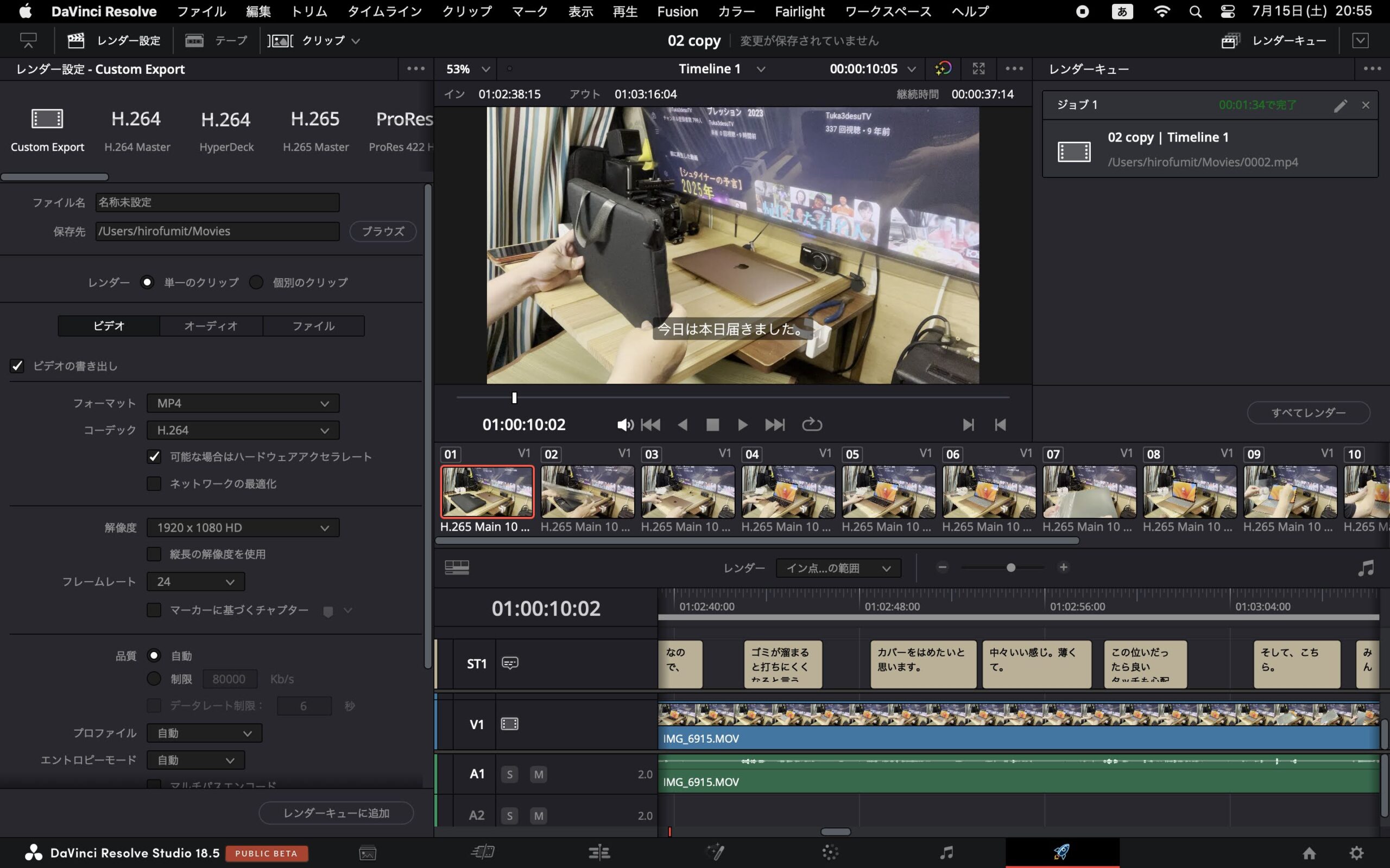 今回は、つなぎ合わせてテロップつけ、音楽を挿入するだけだったので、驚くほど早くレンダリングして
