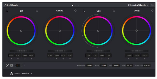 「カラーホイール」パレットには、一般に最初の調整を構成する「リフト」、「ガンマ」、「ゲイン」コントロールが含まれています。